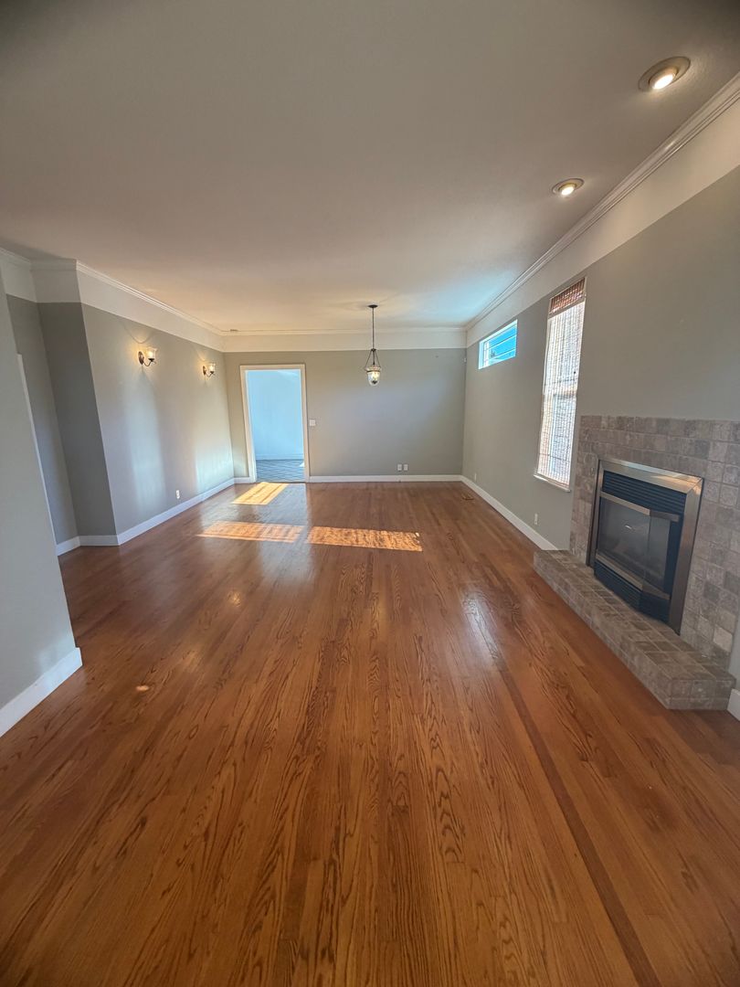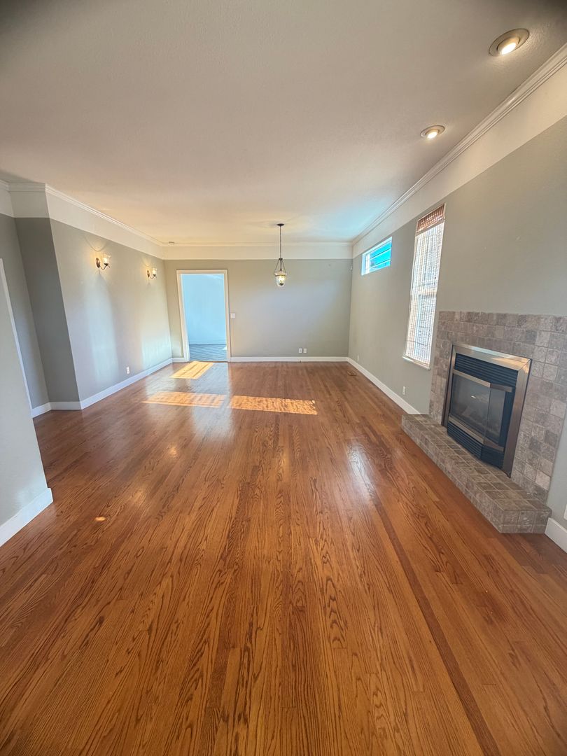 The spacious living room features original wood flooring and a cozy gas fireplace, creating a warm and welcoming atmosphere. Two of the bedrooms are carpeted, while the kitchen and formal dining room offer durable tile flooring. The primary bedroom includes two closets and an en-suite bathroom for added convenience.