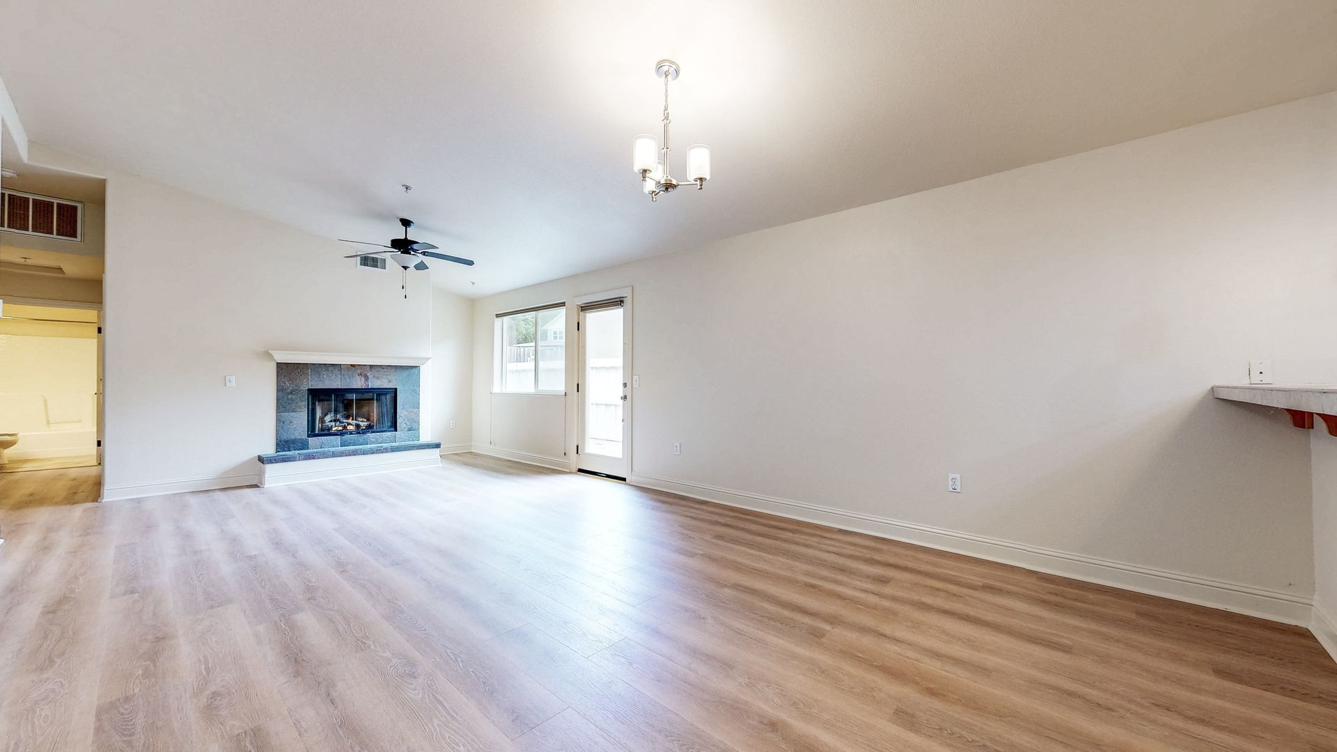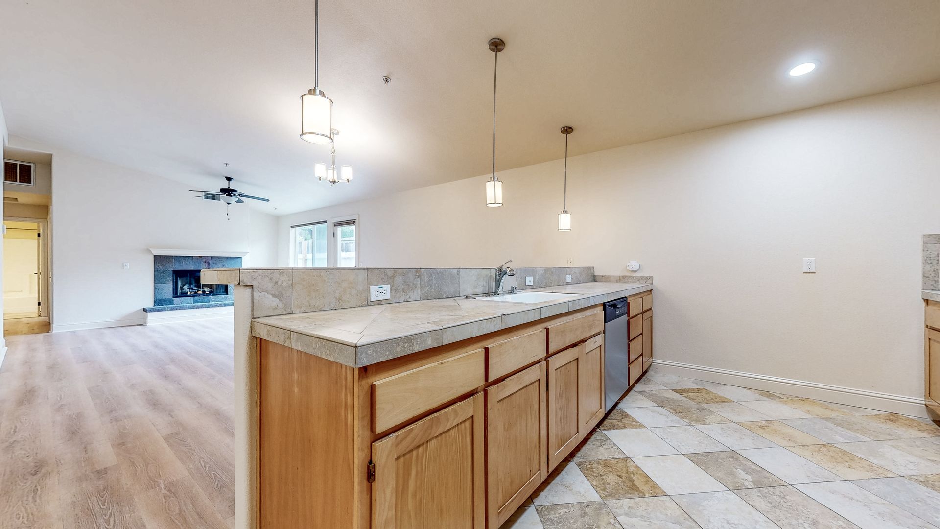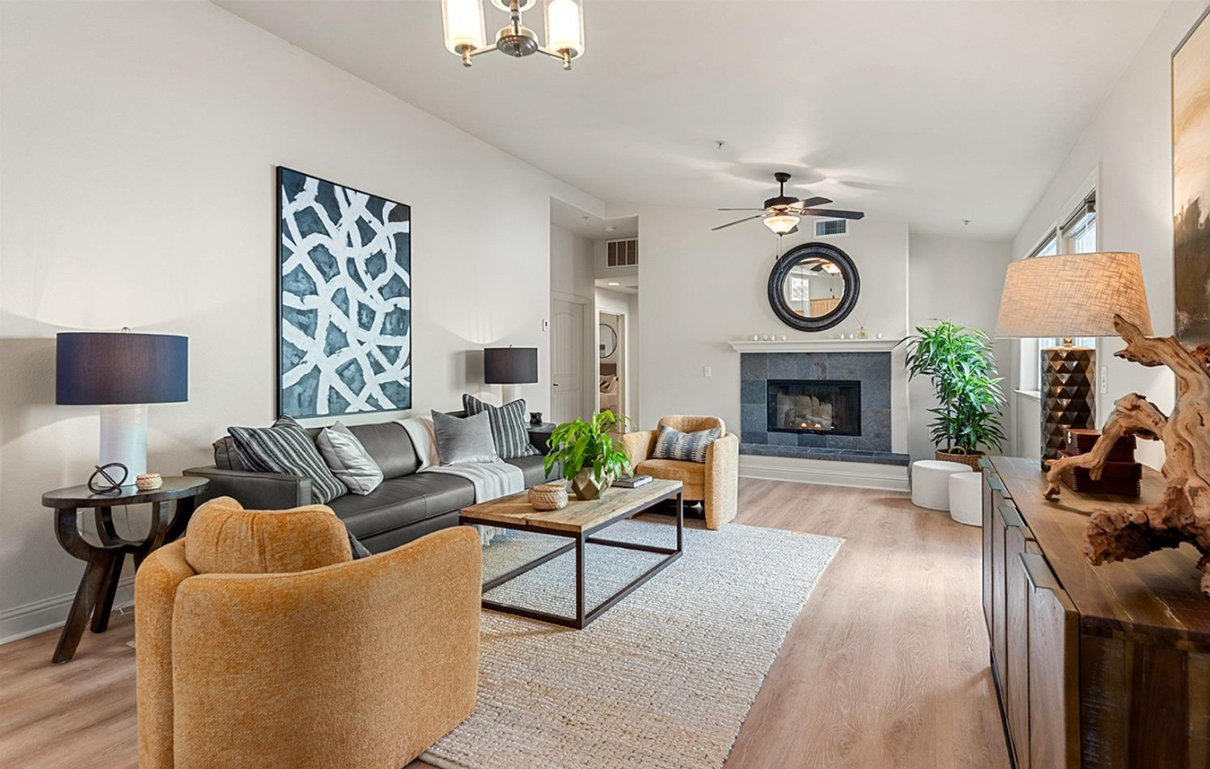 Step into the inviting great room featuring an elegant gas fireplace, perfect for cozy evenings. With three generous bedrooms, two full baths, and a private enclosed backyard, this home offers both comfort and versatility for easy living. One designated carport located in the parking lot of Harmony Village.