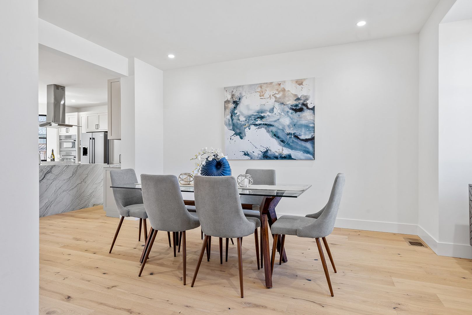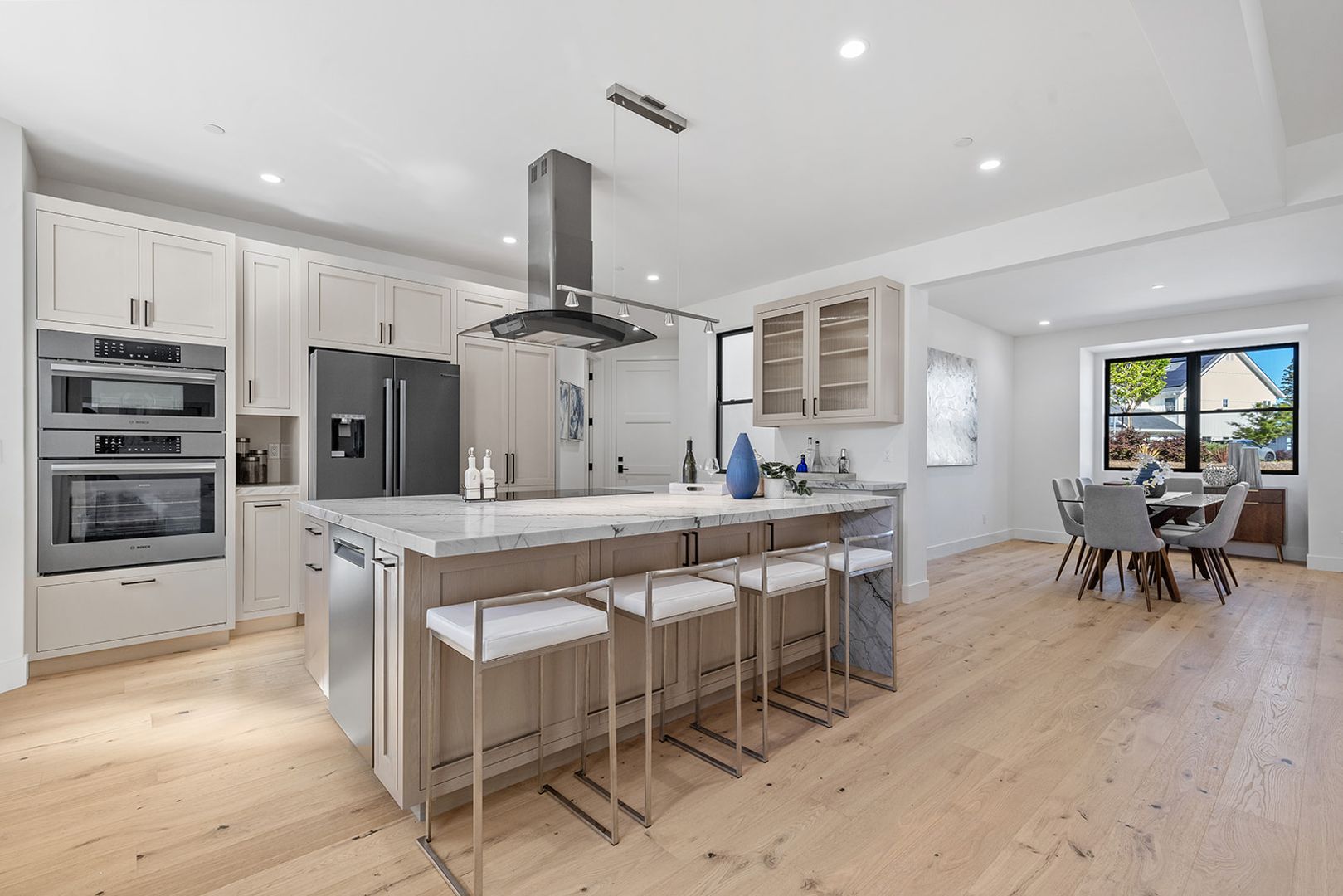 The home welcomes you with a formal entry that leads into an open and inviting layout featuring a spacious dining area and generous living spaces perfect for gatherings or quiet relaxation. The kitchen is a standout feature, complete with a large center island, premium appliances, and a cleverly designed hidden walk-in pantry that keeps everything neatly organized and out of sight.